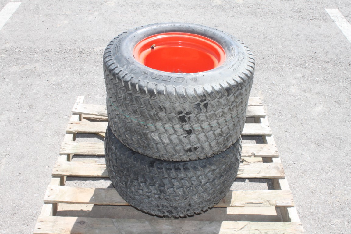Model: Pair of 24-12.00-12 tires on 5 bolt steel Kubota OEM rim, 100% tread, 3" pilot, 4 1/4" bolt circle, orange