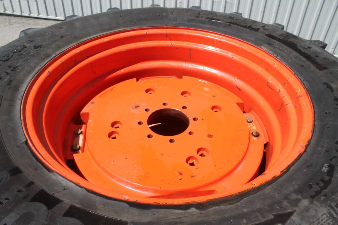 Model: Pair of 460/85R34 tires on 8 bolt cast Kubota OEM rim, 100% tread, 6"pilot, 8" bolt circle, orange