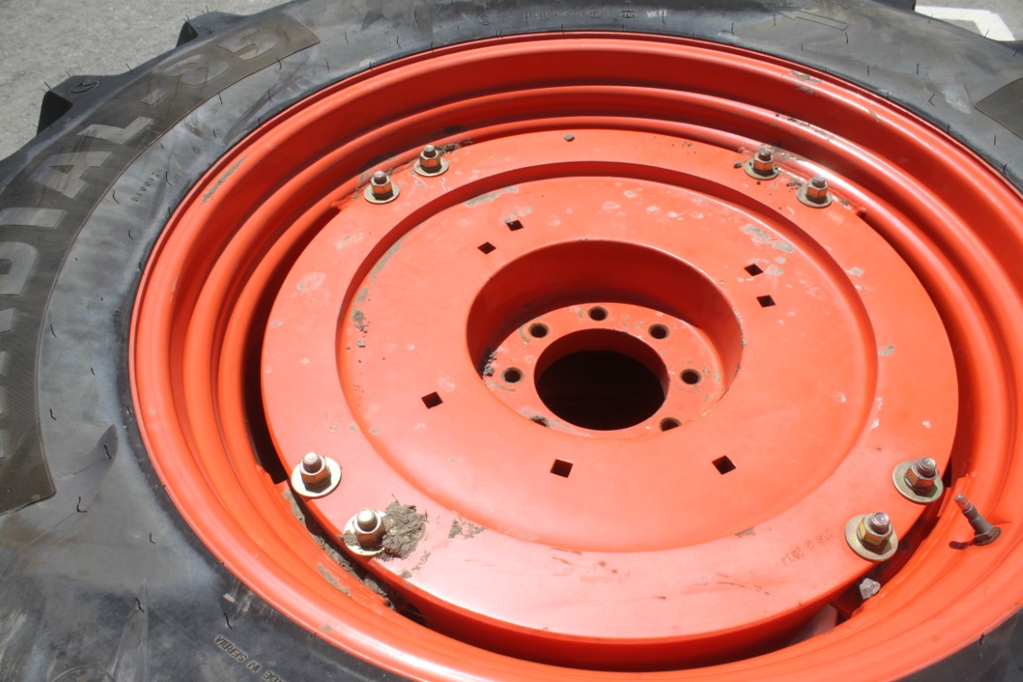 Model: Pair of 460/85R34 tires on 8 bolt cast Kubota OEM rim, 100% tread, 6"pilot, 8" bolt circle, orange