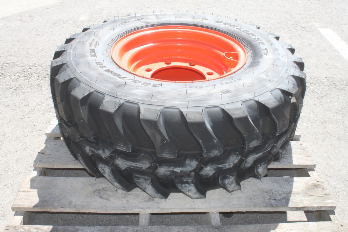 Dunlop One 365/70R18 tires on 8 bolt steel Kubota OEM rim, 100% tread, 8 3/4″pilot, 10 3/4″ bolt circle, orange