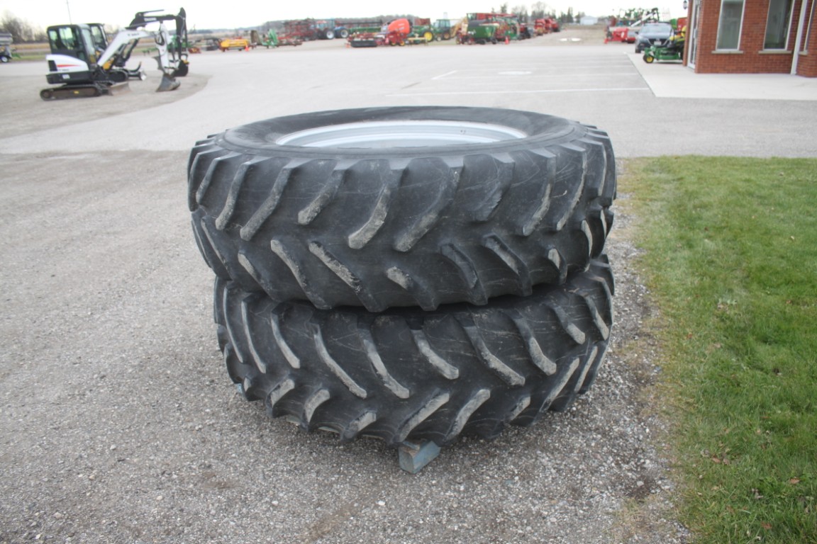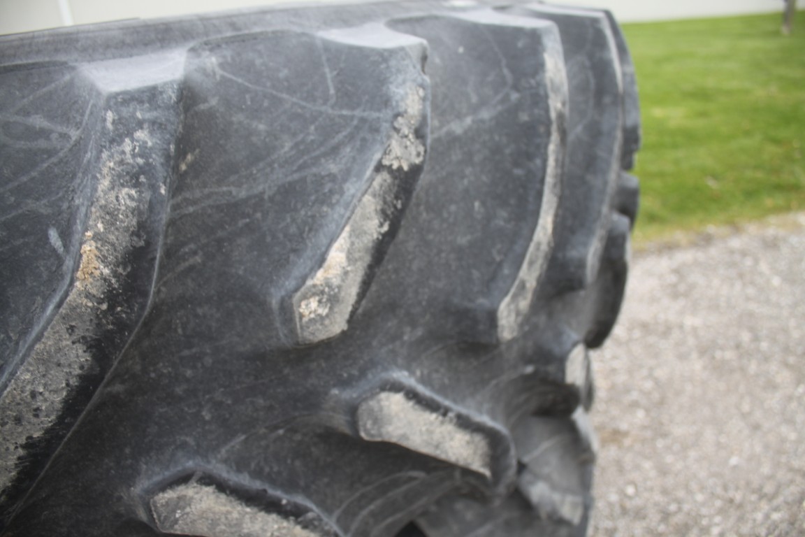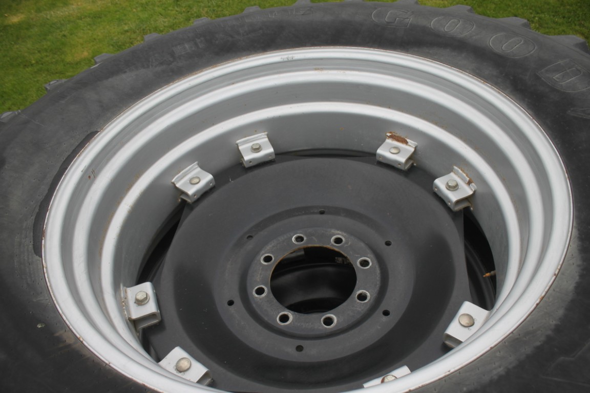 GoodYear 18.4R38 tires on CIH MX series rims, axle hubs, 8 bolt, 8 3/4″ pilot, 10 3/4″ bolt circle, set of two