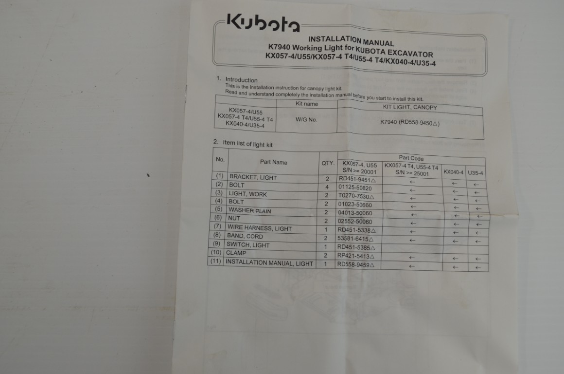 一 Kubota K7940 light kit to fit excavators, U35, U55-4, KX033-4, KX040-4, KX057-4