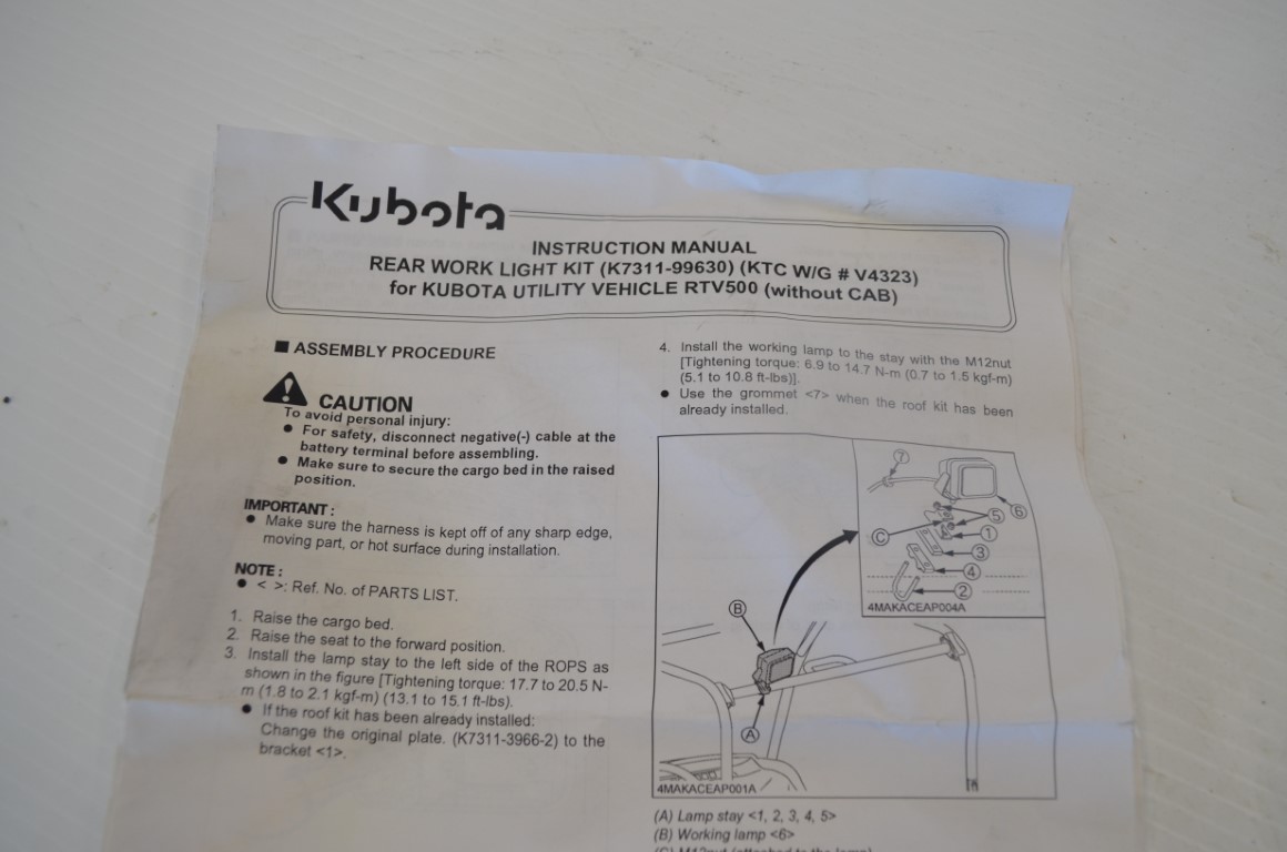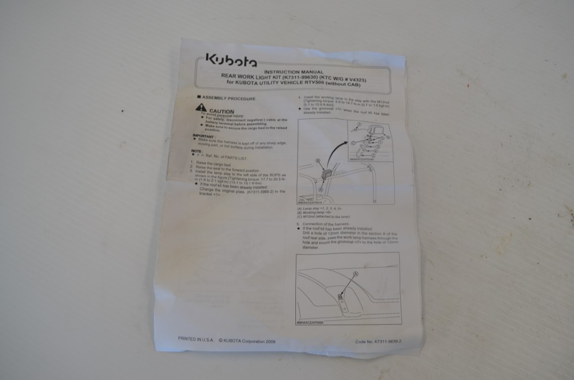 一 Kubota rear work light kit to fit RTV 500, part number V4323