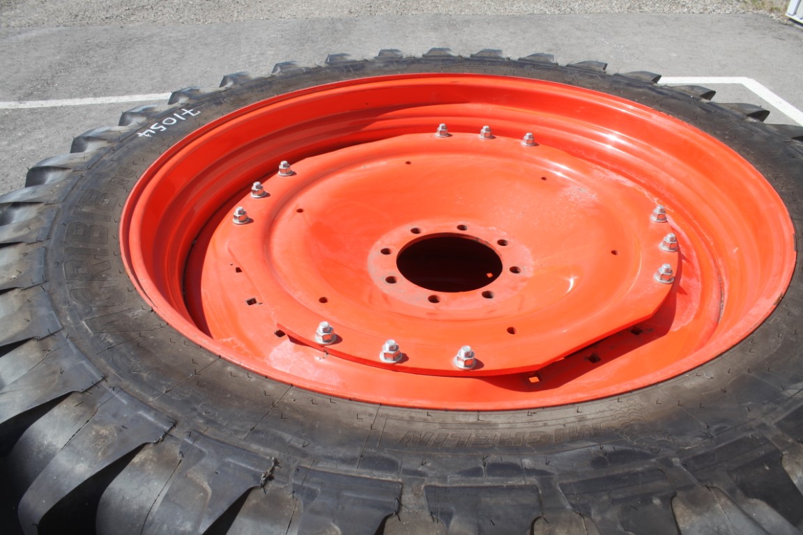 Michelin Pair of 380/90R46 tires on 8 bolt steel Kubota OEM rim, 100% tread, 8 3/4″pilot, 10 3/4″ bolt circle, orange