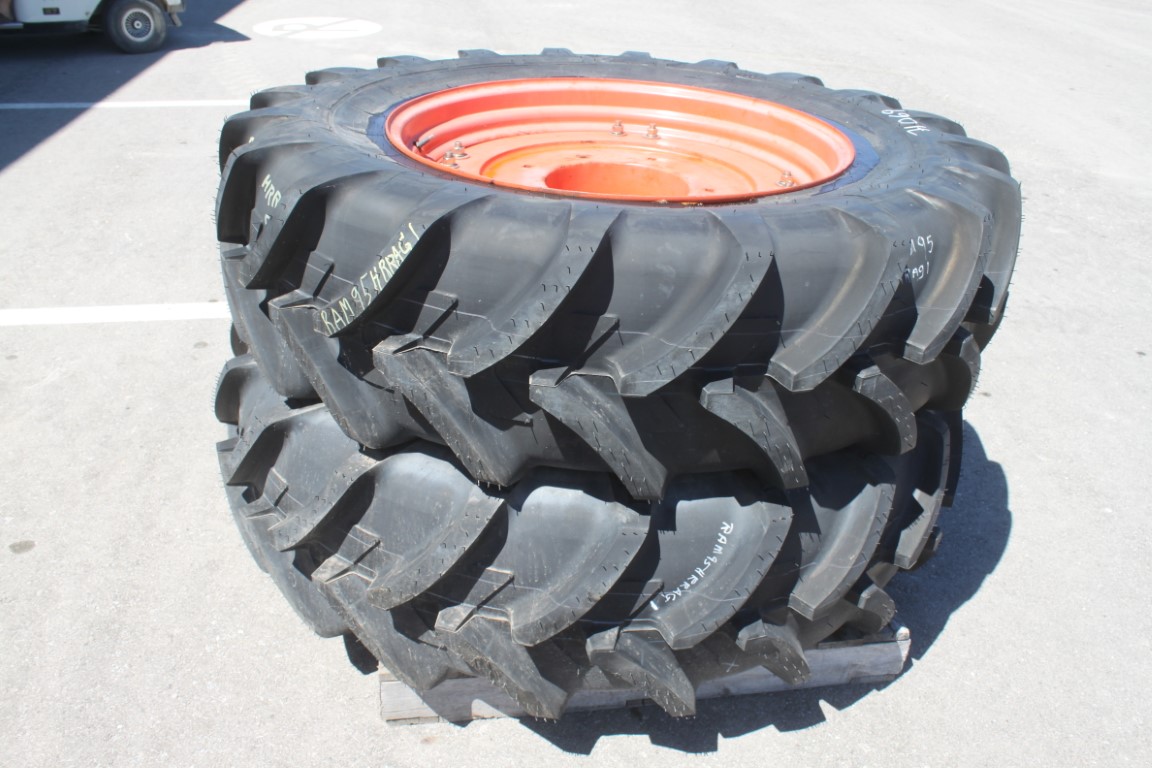 Model: Pair of 420/85R34 tires on 8 bolt cast Kubota OEM rim, 100% tread, 6"pilot, 8" bolt circle, orange