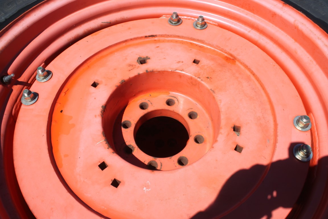 Michelin Pair of 420/85R34 tires on 8 bolt cast Kubota OEM rim, 100% tread, 6″pilot, 8″ bolt circle, orange